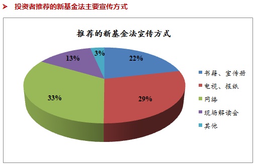 由以上多圖及問卷調(diào)查情況可知,全部被調(diào)查的投資者中瀏覽過新基金法的僅有33%。而在新基金法修訂內(nèi)容對自身影響問題上,覺得對自己影響不大的投資者占比最多,為32%。關(guān)于新基金法中非公募基金具體內(nèi)容了解情況,大多數(shù)投資者表示都不理解。表明投資者對新基金法的關(guān)注度不高,興趣不大。在推薦的新基金法宣傳方式上,網(wǎng)絡(luò)和電視、報(bào)紙占到半數(shù)以上,其次為書籍和宣傳冊,網(wǎng)絡(luò)和電視等傳播媒介同樣是投資者的首選。