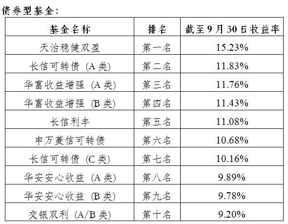 公會(huì)對(duì)上海基金公司今年以來截至9月30日各類型基金的排名情況進(jìn)行了觀察。上?;鸸驹诨旌闲?、債券型和保本型基金延續(xù)著今年以來的出色表現(xiàn)。債券型基金業(yè)績(jī)繼續(xù)高歌猛進(jìn),包攬了行業(yè)前十席。天治穩(wěn)健雙盈債券基金持續(xù)占據(jù)頭把交椅。具體排名如下: