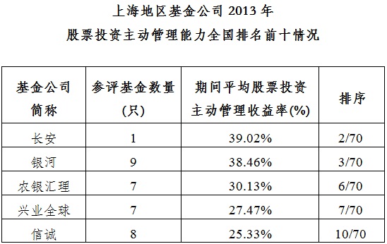 1、2013年全年股票投資主動管理能力全國排名前十的基金公司中,上海地區(qū)占據(jù)5家。(數(shù)據(jù)來源為銀河證券基金研究中心,參評基金為2012/10/31前成立的基金,統(tǒng)計口徑為算術(shù)平均口徑)