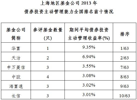 2、2013年全年債券投資主動管理能力全國排名前十的基金公司中,上海地區(qū)占據(jù)6家。(數(shù)據(jù)來源為銀河證券基金研究中心,參評基金為2012/10/31前成立的基金,統(tǒng)計口徑為算術(shù)平均口徑)
