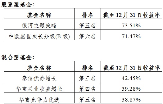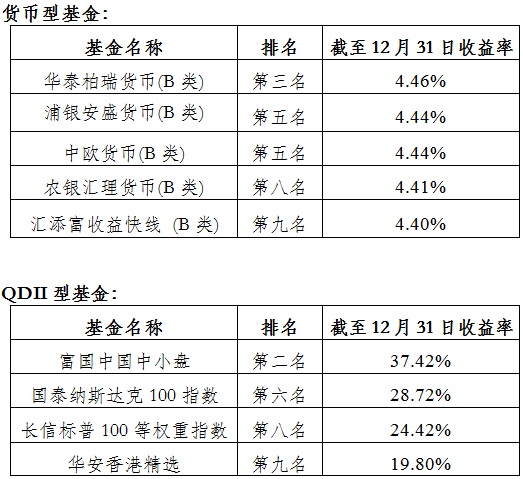 截至2013年12月31日,在全國主要類別基金收益率排名前十基金中,上海地區(qū)基金公司旗下基金在股票型基金中有2只,混合型基金中有3只,債券型基金有7只,保本型基金有6只,貨幣型基金有5只,QDII型基金有4只(分類標(biāo)準(zhǔn)為銀河基金一級分類標(biāo)準(zhǔn))。具體排名如下:
