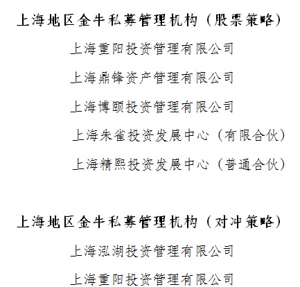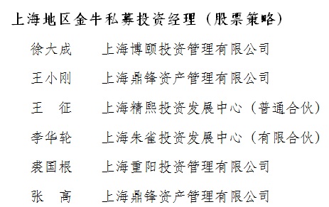 私募金牛獎(jiǎng)評(píng)選致力于為投資者甄選出能持續(xù)、穩(wěn)定創(chuàng)造絕對(duì)回報(bào)的私募公司和投資經(jīng)理。本屆私募金牛獎(jiǎng)評(píng)選出近年來(lái)業(yè)績(jī)優(yōu)秀的十大股票策略類金牛私募管理公司,分別是展博投資、重陽(yáng)投資、鼎鋒資產(chǎn)、博頤投資、朱雀投資、民森投資、精熙投資、星石投資、明曜投資、和聚投資,上海地區(qū)成為獲取金牛獎(jiǎng)公司最聚集的地區(qū)之一。