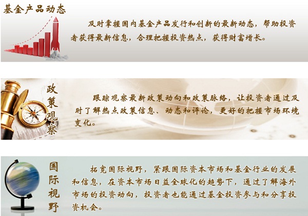 同時,新增基金產品動態(tài)、政策觀察、國際視野三大板塊內容。新增版塊分別著手于產品發(fā)行和創(chuàng)新最新動態(tài)、影響資管行業(yè)最新政策信息、國際市場投資動向等方面。通過資料采集、整理和匯總,實時添加更新。多渠道、多角度、多層次、全方位的為不同知識結構和層次的投資人提供了有效信息資訊平臺,對于原有的僅限于普通基金投資人的基金學院,提供了更專業(yè)化和深層次的理財知識。