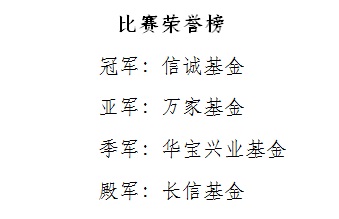 體育是美好的,它帶給我們精彩、激情、拼搏和熱血;同時又是現(xiàn)實(shí)的、殘酷的,冠軍的魅力促使著每一位球員都奮力爭取。最終的排名賽中,長信基金輕松戰(zhàn)勝金元惠理基金,挺進(jìn)4強(qiáng);萬家基金小勝申萬菱信基金,最終獲得本屆賽事第三名;華寶興業(yè)基金在戰(zhàn)勝鑫元基金后,未能繼續(xù)前進(jìn),止步4強(qiáng);信誠基金輕取廣發(fā)基金,殺入4強(qiáng)。緊張激烈的競爭,最終獲得各項(xiàng)比賽榮譽(yù)的球隊(duì)如下: