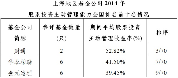 1、2014年全年股票投資主動管理能力全國排名前十名基金公司中,上海地區(qū)占據(jù)3家。(數(shù)據(jù)來源為銀河證券基金研究中心,參評基金為2013/12/31前成立的基金,統(tǒng)計口徑為算術平均口徑)