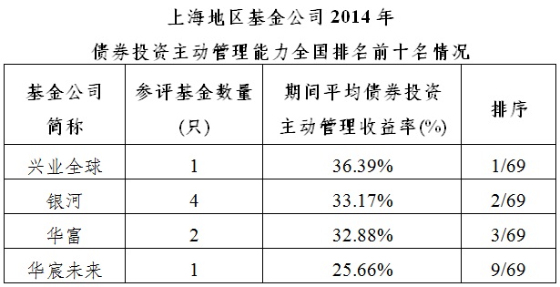 2、2014年全年債券投資主動管理能力全國排名前十名基金公司中,上海地區(qū)占據(jù)4家。(數(shù)據(jù)來源為銀河證券基金研究中心,參評基金為2013/12/31前成立的基金,統(tǒng)計口徑為算術平均口徑)