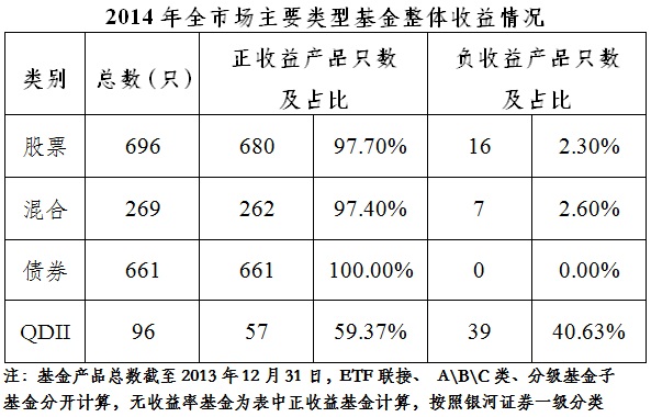 2014年,主要市場指數(shù)大幅上揚,主要類型基金基本全部實現(xiàn)正收益。其中股票型、混合型基金正收益比例分別高達97.70%和97.40%,債券型基金全部獲得正收益,QDII型基金收益近六成為正收益。具體情況如下: