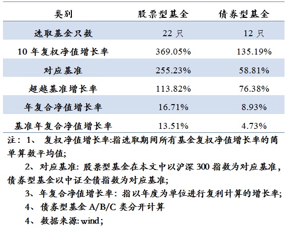 根據(jù)上表數(shù)據(jù)顯示,10年期股票型基金整體平均收益率大幅超越滬深300指數(shù)113.82%,年復(fù)合凈值增長率高達(dá)16.71%;同期債券型基金整體收益率同樣大幅超越基準(zhǔn)76.38%,雖整體收益率大幅落后股票型基金,但年復(fù)合凈值增長率也達(dá)8.93%。