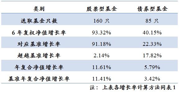 據(jù)上表信息顯示,自2009年初至2014年末6年間,全部股票型基金平均復(fù)權(quán)凈值增長率93.32%,略微超過滬深300指數(shù)91.18%的漲幅,年復(fù)合凈值增長率為11.61%;同期,全部債券型基金獲取40.15%的復(fù)權(quán)凈值增長率,年復(fù)合凈值增長率為5.79%,超過對應(yīng)基準(zhǔn)3.42%漲幅。