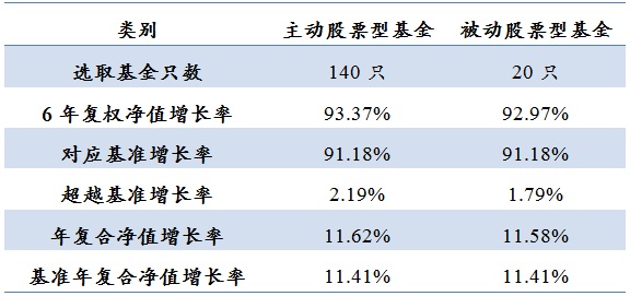 從上述6年期股票型、債券型基金收益情況來看,股票型基金沒有獲取太多超額收益,同期的債券型基金業(yè)績則超越中證全債指數(shù)17.82%;股票型基金在絕對收益率上大幅超越債券型基金,但在超越基準(zhǔn)收益率上,則是債券型基金占優(yōu)。兩者分別11.61%和5.79%的年復(fù)合凈值增長率仍舊是中長期投資理想的投資工具,體現(xiàn)基金管理人的專業(yè)投資能力。同期主動和被動股票型基金業(yè)績基本同步,沒有超額收益的獲取。