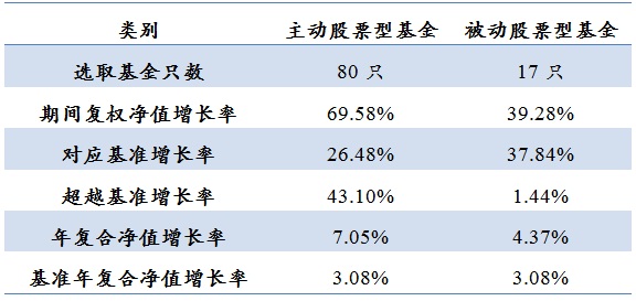 根據(jù)上表數(shù)據(jù),在10年期業(yè)績表現(xiàn)上,所選取的主動和被動股票型基金復(fù)權(quán)凈值增長率差距較大,主動型股票型基金要比被動股票型基金高出155%的復(fù)權(quán)凈值增長率,相對基準(zhǔn)177.25%的超額收益同樣遠(yuǎn)遠(yuǎn)大于被動股票型基金的22.19%。