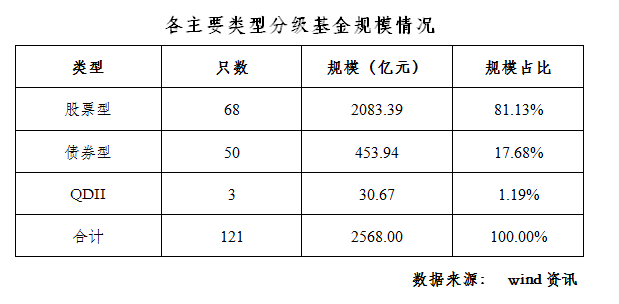 截至2015年1季度末,市場各分級基金共計121只(母基金代碼統(tǒng)計),主要以股票型為主。68只股票型分級基金規(guī)模達(dá)到2083.39億元,占整體規(guī)模2568億元的81.13%;50只債券型基金規(guī)模453.94億元,3只QDII型基金規(guī)模30.67億元。