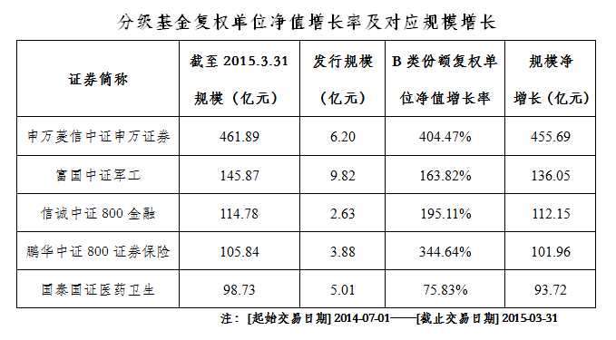 自2014年7月1日至2015年3月31日,結(jié)構(gòu)化行情催生行業(yè)分級基金份額突飛猛進(jìn),以證券板塊為代表的結(jié)構(gòu)化上漲行情帶動相關(guān)主題分級基份額急劇膨脹。從相關(guān)數(shù)據(jù)來看,行業(yè)和主題切入市場階段性熱點的分級基金,其B類份額凈值增長率和規(guī)模增長都有較佳表現(xiàn)。圖為2014年7月1日前成立的規(guī)模排名前五的分級基金B(yǎng)類份額單位凈值增長率與對應(yīng)整體基金份額表。