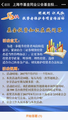 為貫徹落實《證券期貨投資者適當性管理辦法》,進一步幫助投資者提升風險防范意識,公會根據(jù)上海證監(jiān)局投保工作要求和統(tǒng)一部署,自2017年7月17日至7月31日開展《基金投資知識在線問答》投資者保護專項宣傳活動。