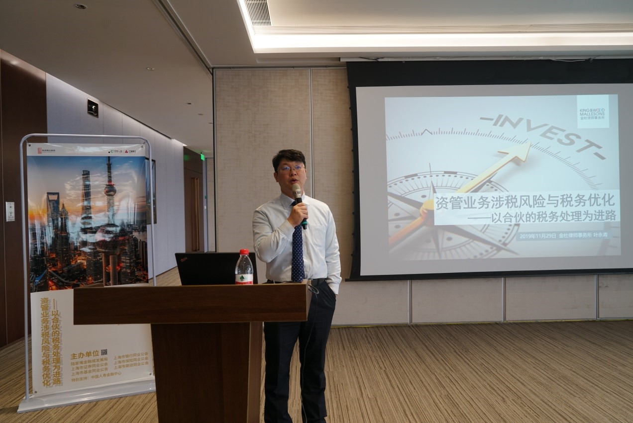 在此背景下,陸家嘴金融城發(fā)展局聯(lián)合上海市基金同業(yè)公會(huì)等機(jī)構(gòu)于2019年11月29日共同舉辦了“資管業(yè)務(wù)涉稅風(fēng)險(xiǎn)與稅務(wù)優(yōu)化——以合伙的稅務(wù)處理為進(jìn)路”專題講座。特邀北京市金杜律師事務(wù)所上海分所稅務(wù)專家葉永青律師主講。來自基金、信托、證券資管等機(jī)構(gòu)的逾240位財(cái)務(wù)相關(guān)業(yè)務(wù)部門人員參加了此次講座。