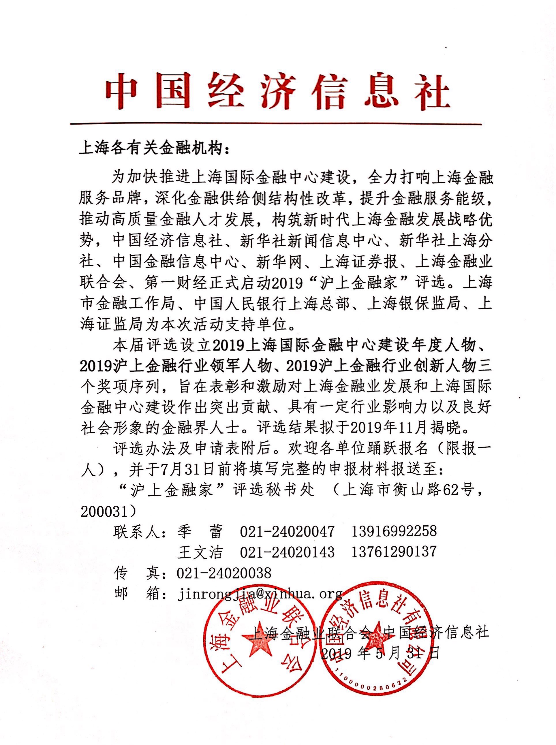 根據(jù)上海金融業(yè)聯(lián)合會及新華社中國經濟信息社《2019“滬上金融家”評選通知》,2019“滬上金融家”評選工作已正式啟動。