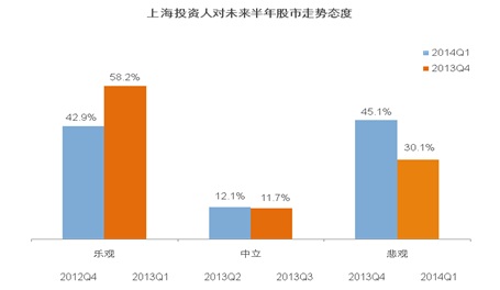具體來(lái)看,在上海投資人方面,看好未來(lái)中國(guó)股市走勢(shì)的上海投資人由上季度的58.2%降至42.9%,對(duì)中國(guó)股市走勢(shì)持中立態(tài)度的投資人由上季度的11.7%上升至12.1%,而對(duì)中國(guó)股市持悲觀預(yù)期的投資人則由上季度的30.1%上升至45.1%。上海投資人持有股票的比例由上季度的69.9%降至54.2%,在股票市場(chǎng)上投入的資金比重由上季度的33.8%降至29.5%,預(yù)計(jì)增持股票比例由29.8%降至16.1%,幾項(xiàng)數(shù)據(jù)的回落均體現(xiàn)了上海投資人對(duì)股市前景相對(duì)謹(jǐn)慎的投資態(tài)度。