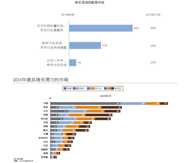 在香港投資人方面,從投資人對(duì)于股市的態(tài)度來(lái)看,近三分之二的香港投資人(62%)認(rèn)為香港股票市場(chǎng)將維持牛熊爭(zhēng)持、反復(fù)震蕩的格局,31%的香港投資人則對(duì)未來(lái)股市走勢(shì)持悲觀預(yù)期,僅7%的香港投資人對(duì)未來(lái)香港股票市場(chǎng)持樂(lè)觀態(tài)度。77%的香港投資人表示股票在投資組合比例中會(huì)維持不變,而上季度則有達(dá)32%表示會(huì)增持股票。本期的“2014年最具增長(zhǎng)潛力市場(chǎng)”調(diào)查板塊,在“首要最具增長(zhǎng)潛力市場(chǎng)”的投票中,中國(guó)市場(chǎng)與香港市場(chǎng)得票比例為44: 5;在“前三位最具增長(zhǎng)潛力市場(chǎng)”的投票中,中國(guó)市場(chǎng)與香港市場(chǎng)得票比例為173: 53。在滬港通背景下,此數(shù)據(jù)顯示出相當(dāng)比例的香港投資人對(duì)A股市場(chǎng)有興趣。