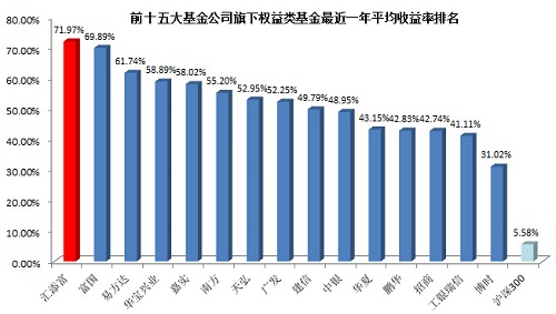 先看最近一年的歷史業(yè)績。銀河證券基金研究中心數(shù)據(jù)顯示,截止2015年12月末,在過去一年間,匯添富平均股票投資主動管理收益率為71.97%,在前十五大基金公司中排名第一,富國、易方達、華寶興業(yè)、嘉實等緊隨其后,同期滬深300漲幅僅為5.58%!
