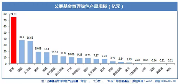 聯(lián)合中證指數(shù)公司努力實(shí)現(xiàn)“中證阿拉善生態(tài)100指數(shù)”產(chǎn)品化的富國基金是市場上最早一批成立的基金管理公司,也是市場上率先開展綠色投資的基金公司之一;截至2016年6月30日,富國基金共管理綠色公募產(chǎn)品74.61億元,規(guī)模占公募基金綠色產(chǎn)品的比例達(dá)到27.99%,排名全市場第一。