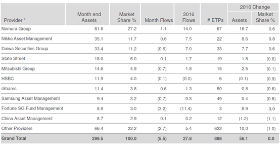 附表:亞太地區(qū)ETP供應(yīng)商排名(按所管理ETP總規(guī)模;單位:10億美元)