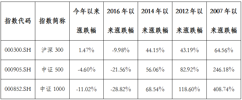 如果只是從今年4個(gè)多月的短期走勢來看,大家都覺得是大盤股PK掉了中小盤股,那么把時(shí)間坐標(biāo)拉長呢?三年、五年、十年呢?從A股市場歷年走勢來看,越是長周期下,中小盤個(gè)股的收益率越發(fā)明顯,2007年以來到現(xiàn)在的10年多時(shí)間里,中證500的收益率是滬深300的3.8倍,而中證1000的收益率更是滬深300的6.3倍。