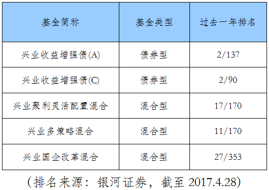 截至2017年4月21日,興業(yè)基金旗下多只基金均排名同類型產(chǎn)品前1/10,覆蓋從二級債基、“固收 +”混合策略到主動管理、主題投資等多種不同類型基金產(chǎn)品,個基表現(xiàn)搶眼。