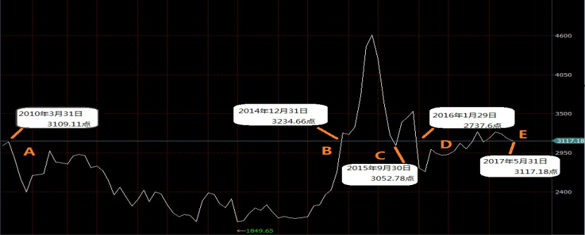 站在當(dāng)前的市場(chǎng)點(diǎn)位,考察區(qū)間跨一年以上的市場(chǎng)與產(chǎn)品業(yè)績(jī)表現(xiàn)。當(dāng)前,上證指數(shù)為3117.18點(diǎn),市場(chǎng)多次經(jīng)歷該點(diǎn)位。表中,上證指數(shù)從2010年3月的A點(diǎn)到2014年12月的B點(diǎn),再到2015年9月的C點(diǎn),至2016年1月的D點(diǎn),最后至當(dāng)下的E點(diǎn)。