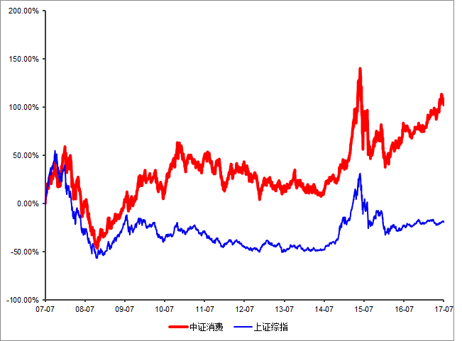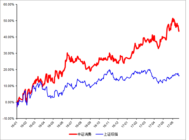再看最近這一段震蕩市,從2016年1月27日-2017年7月19日,兩個指數(shù)的表現(xiàn),上證綜指上升17.50%;中證消費指數(shù)上升45.71%。