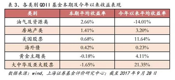 上海證券以細(xì)分類別統(tǒng)計(jì),發(fā)現(xiàn)截至9月28日,年內(nèi)大中華及亞太股票類QDII的平均業(yè)績(jī)最佳,達(dá)到21.35%,而油氣及資源類QDII的表現(xiàn)最差,平均收益率為負(fù)。