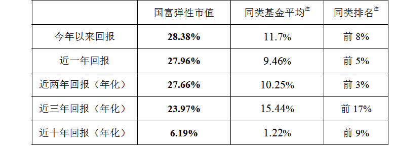 晨星(中國(guó))數(shù)據(jù)顯示,截至9月30日,國(guó)富彈性市值長(zhǎng)短期表現(xiàn)亮眼,近一年回報(bào)27.96%,排名同類(lèi)616只激進(jìn)配置型基金前5%;近兩年年化回報(bào)27.66%,排名同類(lèi)576只激進(jìn)配置型基金前3%;近十年年化回報(bào)6.19%,排名同類(lèi)164只激進(jìn)配置型基金前9%。