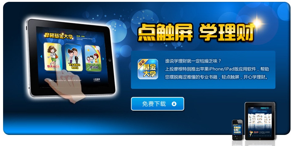 目前投資人可以使用iPhone或iPad等產(chǎn)品通過(guò)APP商店,免費(fèi)在線(xiàn)下載上投摩根基金出品的《愛(ài)與自由》、《數(shù)米的日子》、《寫(xiě)字樓里的理財(cái)經(jīng)》等動(dòng)漫,輕松學(xué)習(xí)基金投資理財(cái)知識(shí)。
