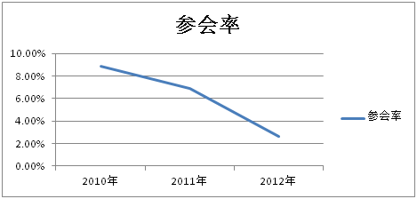 出席股東大會是機(jī)構(gòu)投資者參與上市公司治理最直接有效的途徑,但問卷調(diào)查顯示,機(jī)構(gòu)投資者參與股東大會的積極性卻不高,參會率極低。2010年至2012年三年間,上海102家上市公司共召開股東大會分別為233次、223次、227次,每家上市公司平均年召開股東大會2.26次;同期上市公司股東中的機(jī)構(gòu)投資者平均數(shù)分別為53.08家,62.52家,198.49家,雖然機(jī)構(gòu)投資者數(shù)量逐年上升,但股東大會的參會比例不升反降,機(jī)構(gòu)投資者三年平均參會率僅為8.85%,6.88%,2.62%。