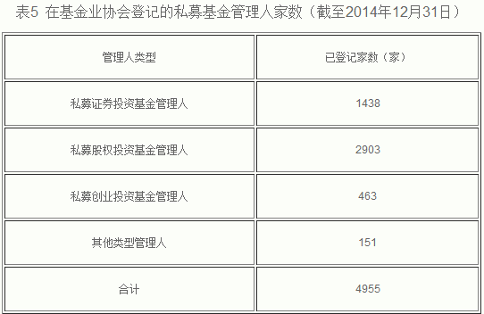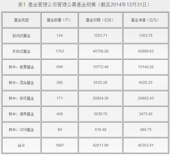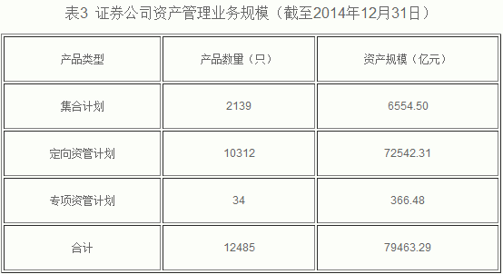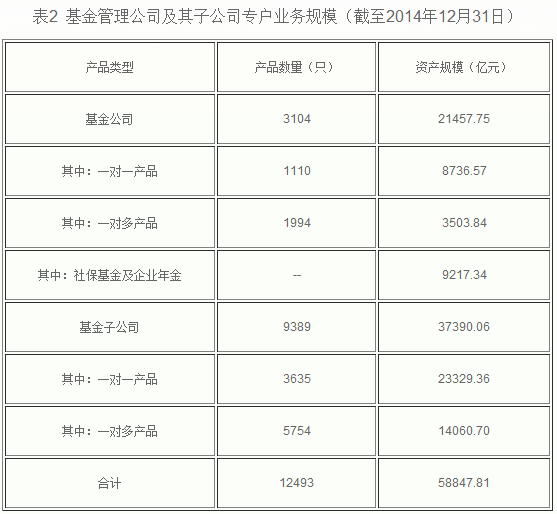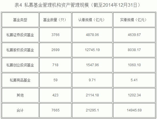 截至2014年12月31日,基金管理公司及其子公司、證券公司、期貨公司、私募基金管理機構(gòu)資產(chǎn)管理業(yè)務(wù)總規(guī)模約20.5萬億元,其中,基金管理公司管理公募基金規(guī)模4.54萬億元,基金管理公司及其子公司專戶業(yè)務(wù)規(guī)模5.88萬億元,證券公司資產(chǎn)管理業(yè)務(wù)規(guī)模7.95萬億元,期貨公司資產(chǎn)管理業(yè)務(wù)規(guī)模124.82億元,私募基金管理機構(gòu)資產(chǎn)管理規(guī)模2.13萬億元。