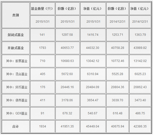 截至2015年1月底,我國境內(nèi)共有基金管理公司95家,其中合資公司46家,內(nèi)資公司49家,共有取得公募基金管理資格的證券公司7家;管理的公募基金資產(chǎn)合計(jì)45449.04億元。