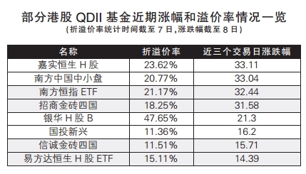 此外,嘉實恒生H股、華夏恒生ETF、南方恒生ETF和南方中國中小盤當日的溢價率也分別高達23.62%、23.62%、21.17%和20.77%。