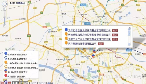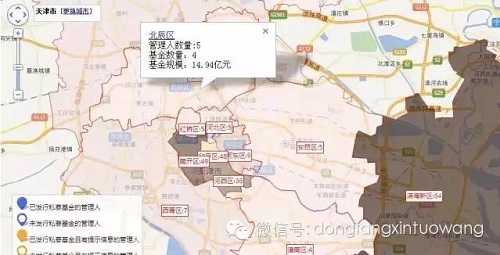 例如天津:可以看到北辰區(qū)5家、南開區(qū)49家、濱海新區(qū)64家……單擊某區(qū)同樣可以看到該區(qū)內(nèi)基金管理人數(shù)量、基金數(shù)量和基金規(guī)模。