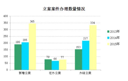 2015年1-12月,證監(jiān)會系統(tǒng)共受理違法違規(guī)有效線索723件,較上年增長明顯,新增立案案件共計345件,同比增長68%(近三年立案案件數(shù)量見下圖);新增涉外案件139起,同比增長28%;辦結(jié)立案案件334件,同比增長54%。立案案件調(diào)查周期平均為86天,較上年減少40天。累計對288名涉嫌當事人采取限制出境措施。凍結(jié)涉案資金共計37.51億元,金額為歷年之最。向公安機關移送案件55件,通報犯罪線索50余起。移交處罰審理案件273件,對767個機構和個人作出行政處罰決定或行政處罰事先告知,同比增長超過100%,涉及罰沒款金額54億余元,超過此前十年罰沒款總和的1.5倍。案件查處數(shù)量持續(xù)攀升,查處周期大幅縮短,罰沒力度明顯增長,震懾效應明顯。