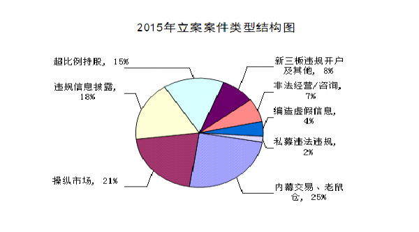1-12月,證監(jiān)會繼續(xù)對內(nèi)幕交易、利用未公開信息交易保持高壓態(tài)勢,立案調(diào)查共計85起,對超比例持股立案調(diào)查53起,案件數(shù)量維持高位。積極踐行以信息披露為中心的監(jiān)管執(zhí)法理念,不斷加大對上市公司信息披露違規(guī)的打擊力度,對信息披露違規(guī)及證券期貨服務機構違法違規(guī)立案調(diào)查共計61起,占比18%,同比增長53 %。針對影響市場秩序的突出問題,重點打擊懲處操縱市場案件,立案調(diào)查共計71起,案件數(shù)量創(chuàng)下近三年來新高,占比達到21%,同比增長373%,其中又以信息操縱、濫用程序化交易操縱、濫用融資融券操縱等新型操縱案件為重點。對非法經(jīng)營證券業(yè)務、非法咨詢立案調(diào)查24件,規(guī)范市場經(jīng)營秩序。首次將編造、傳播虛假信息、證券公司新三板違規(guī)開戶、私募基金違法違規(guī)等類型案件納入執(zhí)法視野,并積極發(fā)揮個案輻射效應,規(guī)范資本市場信息傳播秩序,規(guī)范新三板市場運行,保護投資者合法權益,達到“以點帶面”的打擊效果(2015年立案案件類型結(jié)構見下圖)。
