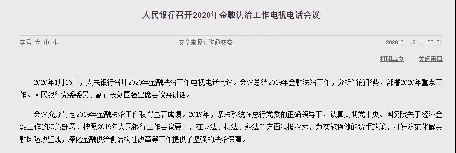 央行網(wǎng)站19日消息,中國人民銀行日前召開2020年金融法治工作電視電話會議,要求加快推進(jìn)《中國人民銀行法》《商業(yè)銀行法》《存款保險條例》《地方金融監(jiān)督管理條例》等重點立法,以高質(zhì)量立法推動、保障高質(zhì)量發(fā)展。