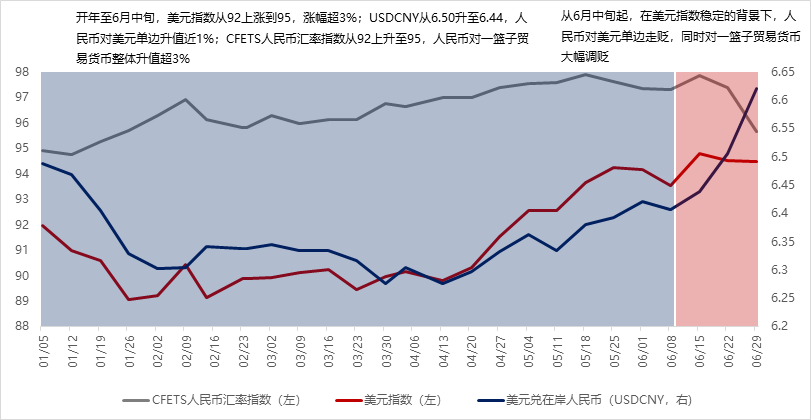 從基本面來說,這波“遲到”的貶值有它的合理性。在6月14日前,美元指數(shù)開年已經(jīng)漲了接近3%,歐元、日元對(duì)美元也有相應(yīng)的貶值幅度,唯獨(dú)人民幣匯率“傲然挺立”,期間對(duì)美元還反向升值了不到1%,對(duì)美歐日等貿(mào)易伙伴的一籃子貨幣更是升值了3%。中國(guó)今年偏弱的經(jīng)濟(jì)基本面并不支持這樣的匯率強(qiáng)勢(shì),因此淤積的貶值壓力本身就需要一個(gè)窗口來集中釋放。
