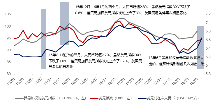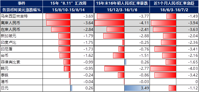 圖表2 過去幾次人民幣對(duì)美元急貶,亞太主要貿(mào)易貨幣無不跟隨貶值,導(dǎo)致貿(mào)易加權(quán)美元指數(shù)出現(xiàn)階段性上升 |