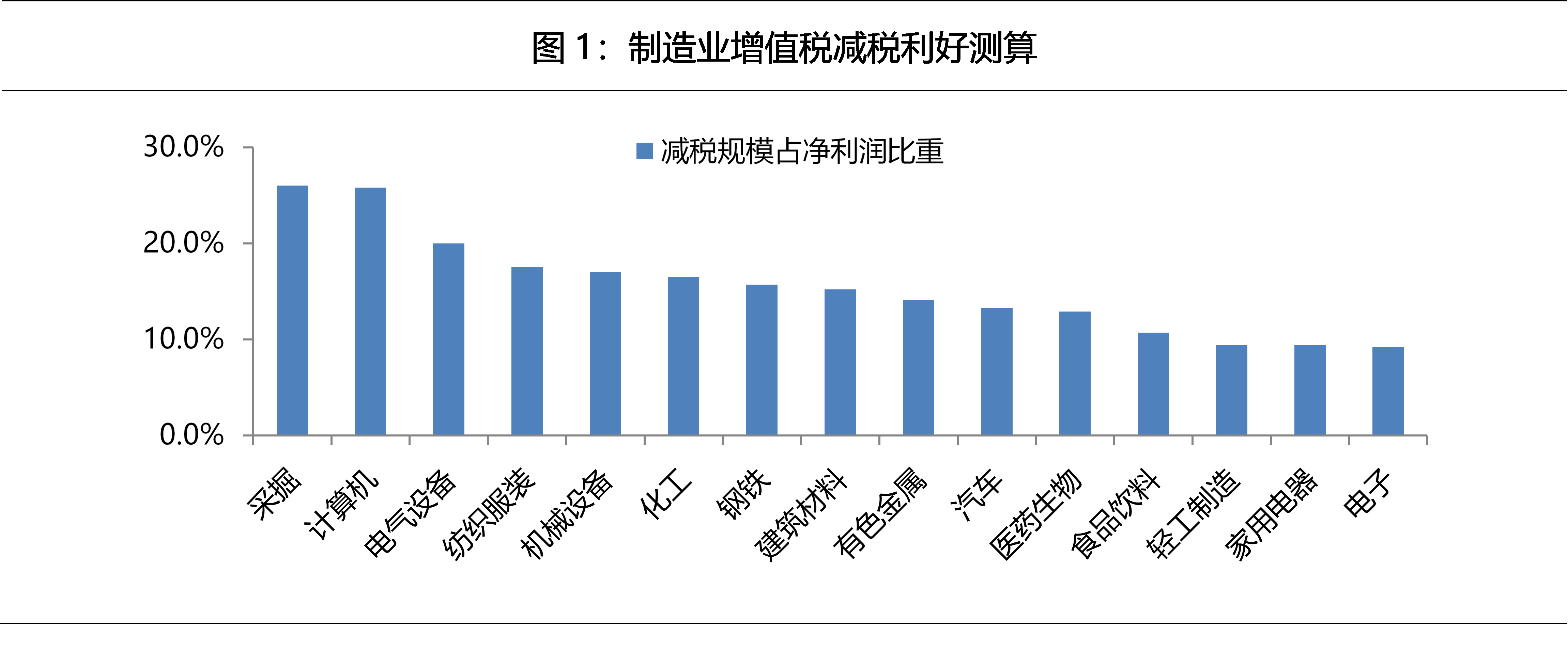 按照政府工作報告的部署,“將制造業(yè)等行業(yè)現(xiàn)行16%的稅率降至13%,將交通運輸業(yè)、建筑業(yè)等行業(yè)現(xiàn)行10%的稅率降至9%,確保主要行業(yè)稅負(fù)明顯降低;保持6%一檔的稅率不變”。根據(jù)測算,增值稅稅率下調(diào),將對采掘、計算機、電氣設(shè)備等行業(yè)形成明顯利好。