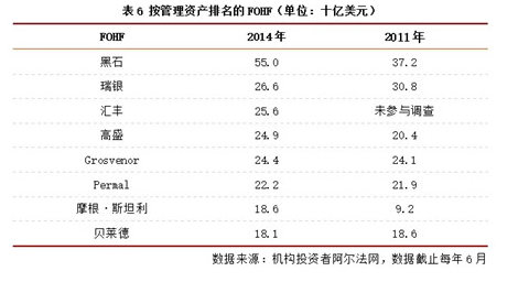 Blackstone Alternative Alpha Funds基金(簡稱BAAF)是黑石旗下FOHF基金之一,于2012年4月1日成立,主要投資以股權(quán)策略為主的一系列黑石對沖基金,目標(biāo)是實現(xiàn)與傳統(tǒng)股權(quán)和固定收入市場具有同等吸引力的長期風(fēng)險調(diào)整回報,截止2014年黑石BAAF基金總資產(chǎn)達(dá)到8.15億美元。對于組合基金中子基金的選擇黑石主要考慮以下幾個因素:1)良好的長期風(fēng)險調(diào)整回報收益;2)基金管理人具有優(yōu)秀的非傳統(tǒng)投資策略;3)較好的短期投資策略;4)具有明確的投資理念;5)具備良好的管理與嚴(yán)格監(jiān)督機(jī)制的基金。BAAF旗下所投對沖基金主要以股票多空策略為主,有時還會投向一些相對價值、事件驅(qū)動策略的子基金。管理費用方面BAAF收費較低,只收取一次費用。