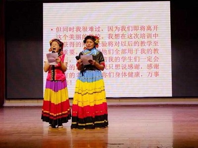 來自達(dá)川區(qū)、白玉縣、馬邊縣的75名鄉(xiāng)村教師以英文戲劇《哈姆雷特》、吉他集體表演《風(fēng)中有朵雨做的云》等豐富多彩的節(jié)目展示了他們在光亞鄉(xiāng)村教師進(jìn)修學(xué)院為期一個月或一周的培訓(xùn)成果。