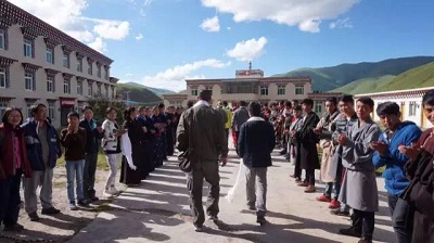 盡管事先預(yù)想到會(huì)有同學(xué)和老師前來(lái)迎接,但當(dāng)身臨其境,還是讓人由衷感動(dòng)。校長(zhǎng)和幾位老師守候在校門口,為每一位尊貴的客人獻(xiàn)上圣潔的哈達(dá)。走進(jìn)校門,“歡迎歡迎”、“扎西德勒”的美好問(wèn)候撲面而來(lái)。藏醫(yī)班的全部175名同學(xué),臉上帶著質(zhì)樸的“高原紅”和純凈和略帶羞澀的微笑,夾道歡迎我們這些遠(yuǎn)道而來(lái)的貴客?!霸谀且豢?,我的眼淚不知道怎么就掉了下來(lái)?!币晃煌潞髞?lái)說(shuō)。而在接下來(lái)的幾天時(shí)間里,這樣的感動(dòng)也無(wú)時(shí)不刻伴隨著我們。