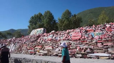 藏區(qū)的另一大特點(diǎn)就是佛教。一路上,不管是隨處可見(jiàn)的五彩經(jīng)幡,還是肅穆的白塔,以及繪在山坡、石塊上的藏語(yǔ)“六字真言”(讀為:?jiǎn)啫璶g 嘛mā呢nī叭bēi 咪mēi 吽hòng,相當(dāng)于“南無(wú)阿彌陀佛”),都提醒你正身處藏傳佛教的圣地。