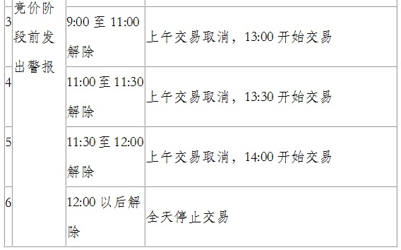 其三,9:00至11:00解除警報(bào)的,上午交易取消,13:00開(kāi)始交易。